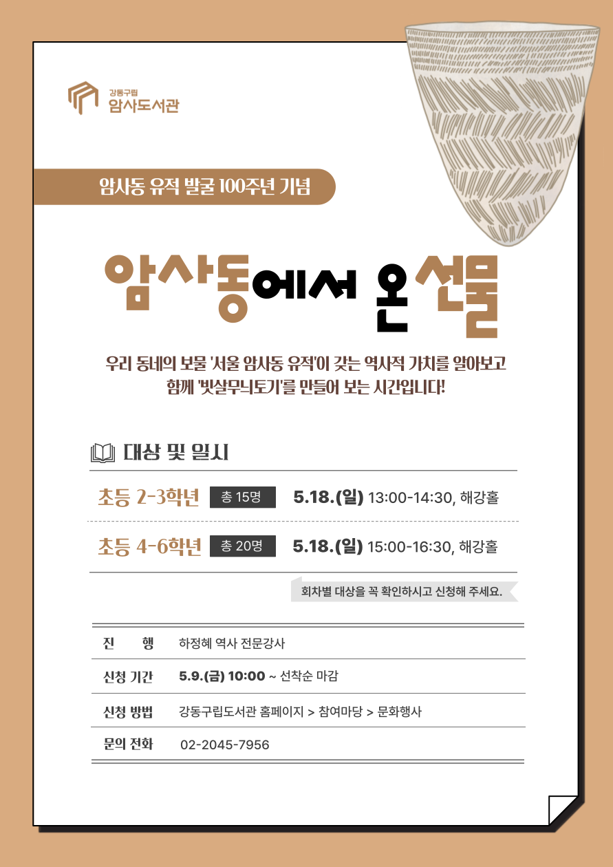 [모집] 암사동에서 온 선물: 빗살무늬토기로 만나는 선사 이야기 (4-6학년)
