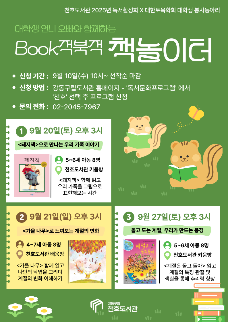 [모집] 천호도서관 9월 독서활성화 「Book적북적 책놀이터」(4~7세) with 대학생 봉사동아리 '코나시'
