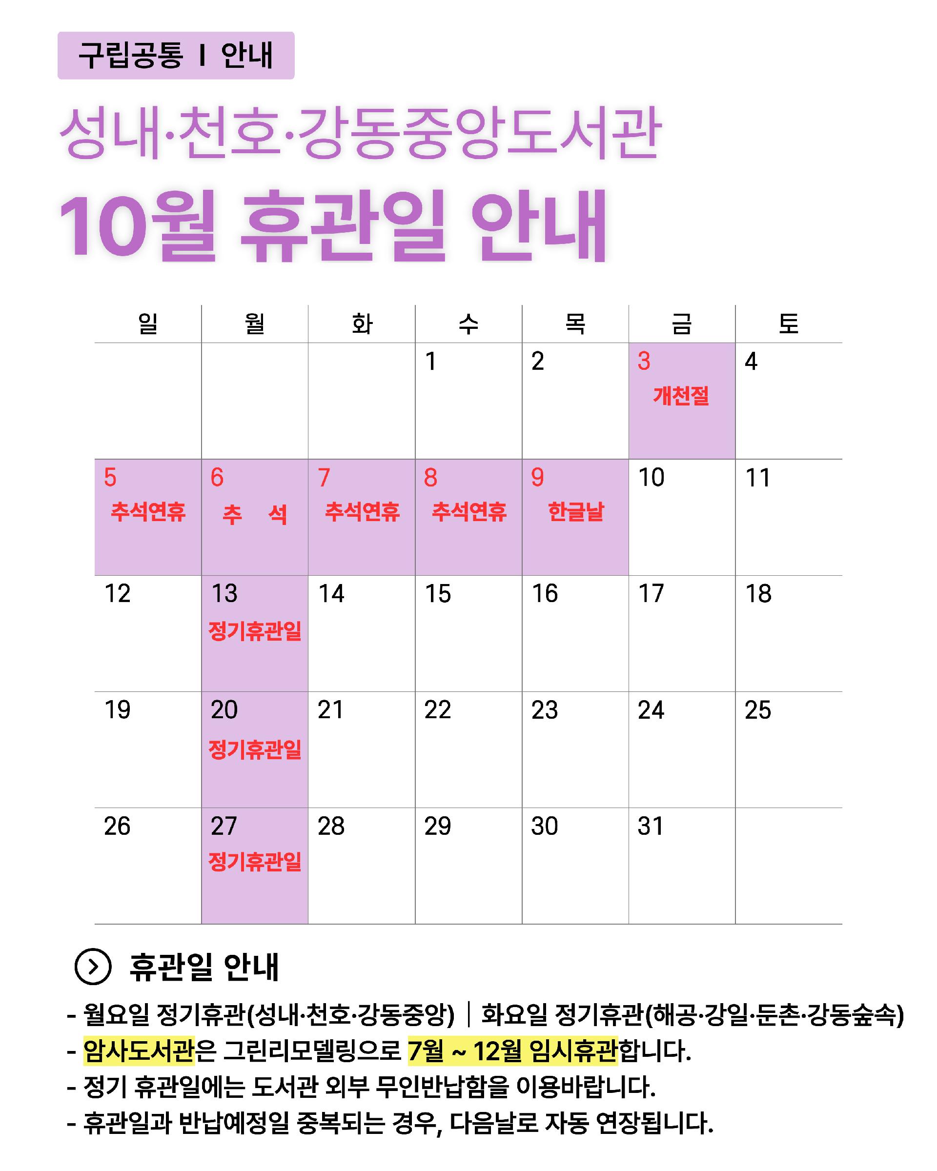 천호도서관 2025년 10월 휴관일 안내📅 ✅ 정기휴관일: 매주 월요일 10월 13일, 20일, 27일 ✅ 법정공휴일: 3일(개천절), 9일(한글날) ✅ 추 석 연 휴: 5일(일), 6일(월), 7일(화), 8일(수) ✅ 개천절 및 추석연휴로 인해 외부반납합 이용이 중단됩니다. 기간: 10/4(토) 오후 5시~10/10(금) 오전 9시 ✅ 휴관일과 반납예정일이 중복되는 경우 다음날로 자동 연장됩니다.