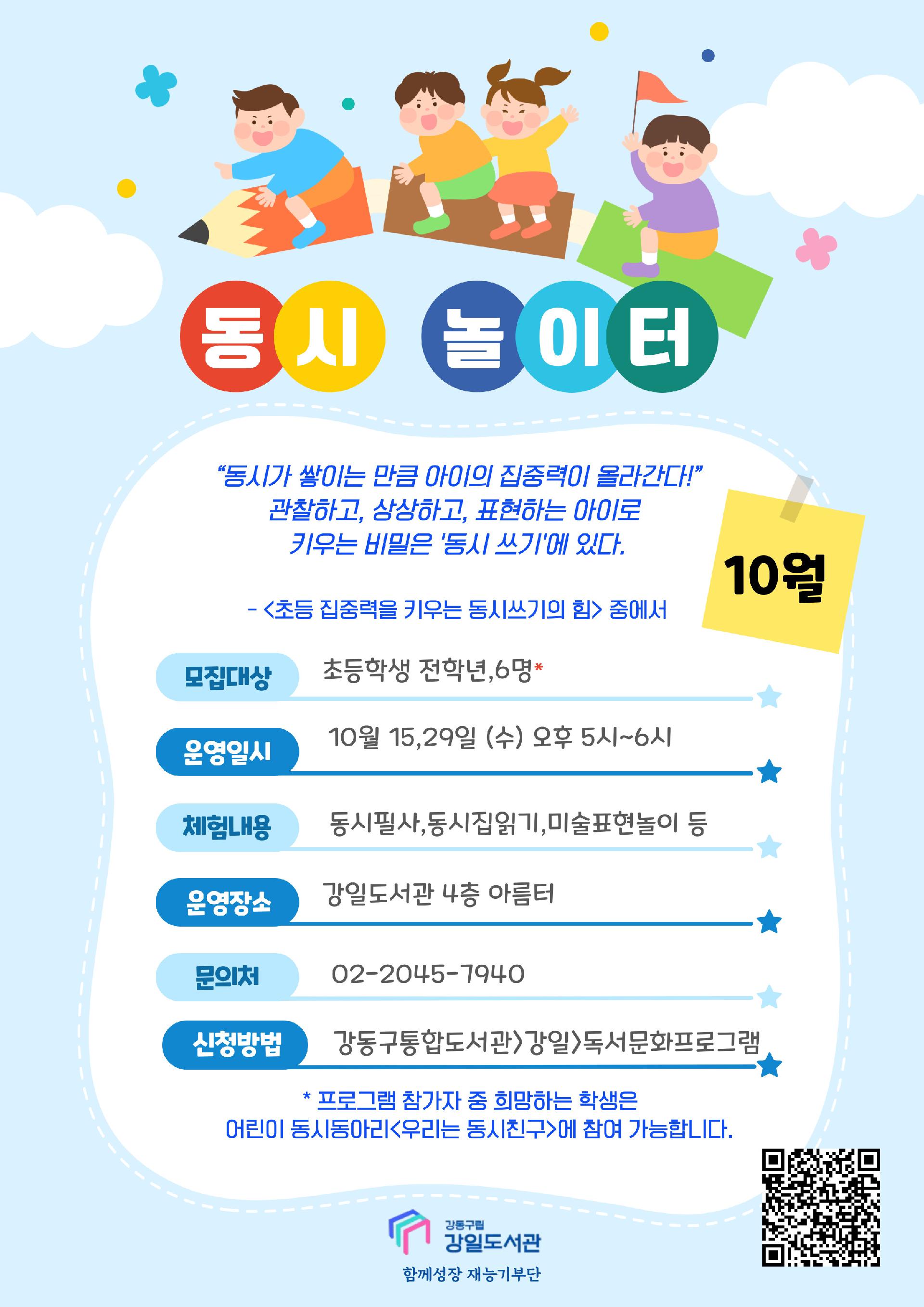 ※ 프로그램 신청 시, 강일도서관 내부 결과보고 및 홍보용 사진 촬영에 동의하는 것으로 간주됩니다.※ 프로그램 신청 후 무통보 불참 시에는 추후 프로그램 참여에 제한을 받을 수 있습니다.※ 프로그램 참여가 어려울 경우, 홈페이지에서 신청 취소 또는 문의 전화번호로 연락 부탁드립니다.