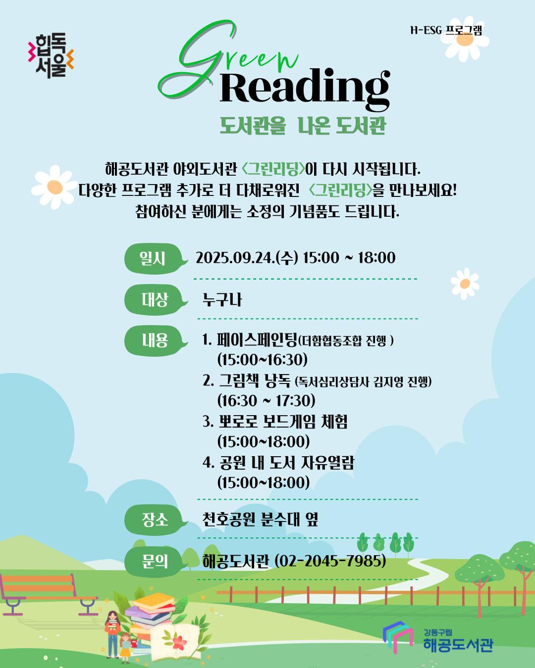 해공도서관 야외도서관 - 도서관을 나온 도서관 <그린리딩> 행사 안내