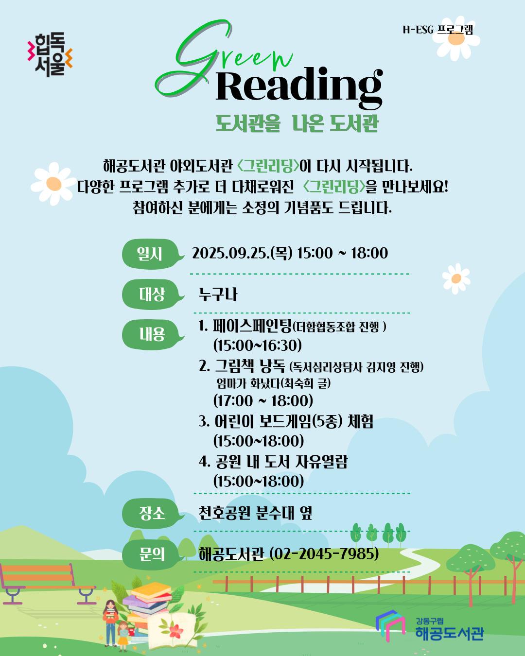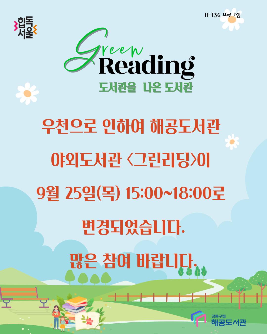 해공도서관 야외도서관 - 도서관을 나온 도서관 <그린리딩> 행사 일정 변경 안내