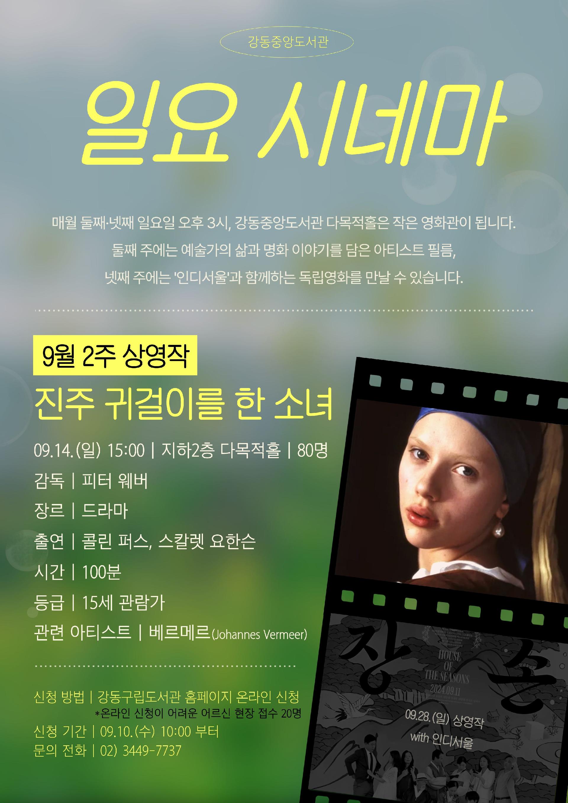강동중앙도서관 9월 「일요 시네마: 진주 귀걸이를 한 소녀」 프로그램 안내
