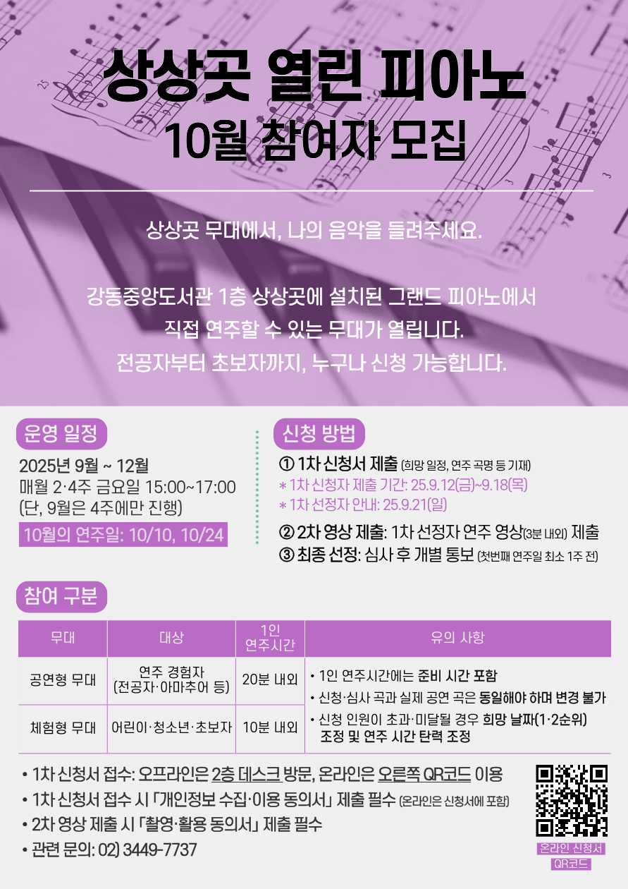 강동중앙도서관 10월 「상상곳 열린 피아노」 참여자 모집 안내