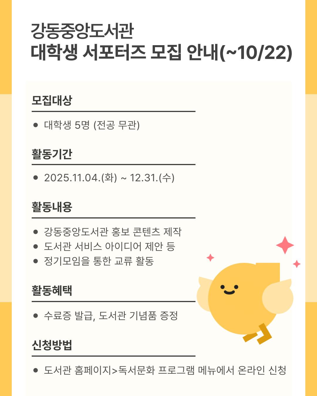강동중앙도서관은 참신한 아이디어와 열정을 가진 대학생 서포터즈를 찾습니다.