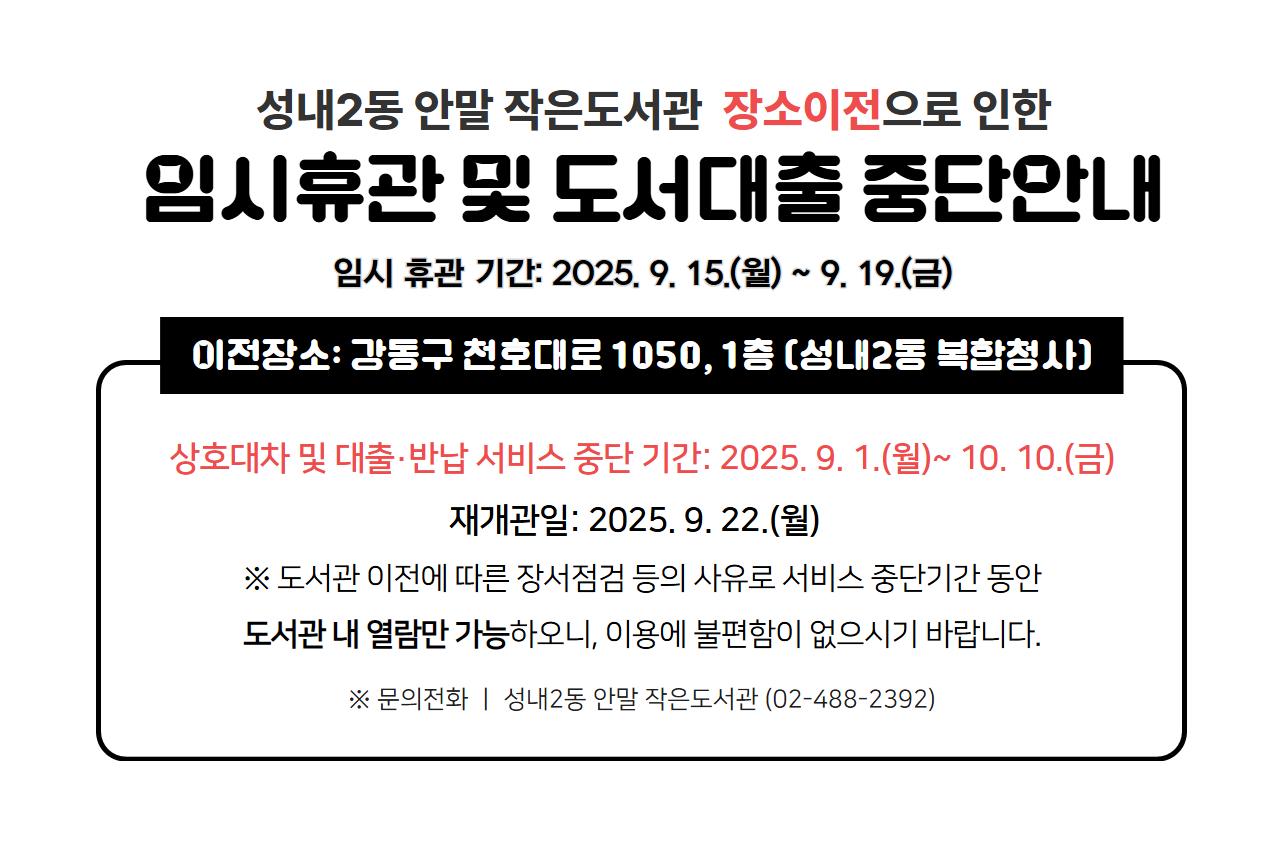 성내2동 안말 작은도서관 임시휴관 및 도서대출 중단안내
