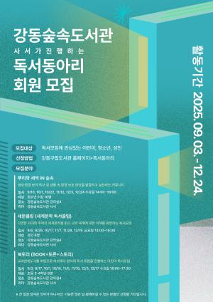강동구립도서관의 독서동아리를 소개합니다. 동네 주민들과 책으로 취향과 관심을 나눠보세요. 새로운 독서동아리를 만들고 싶다면 가까운 구립도서관으로 문의해주세요.