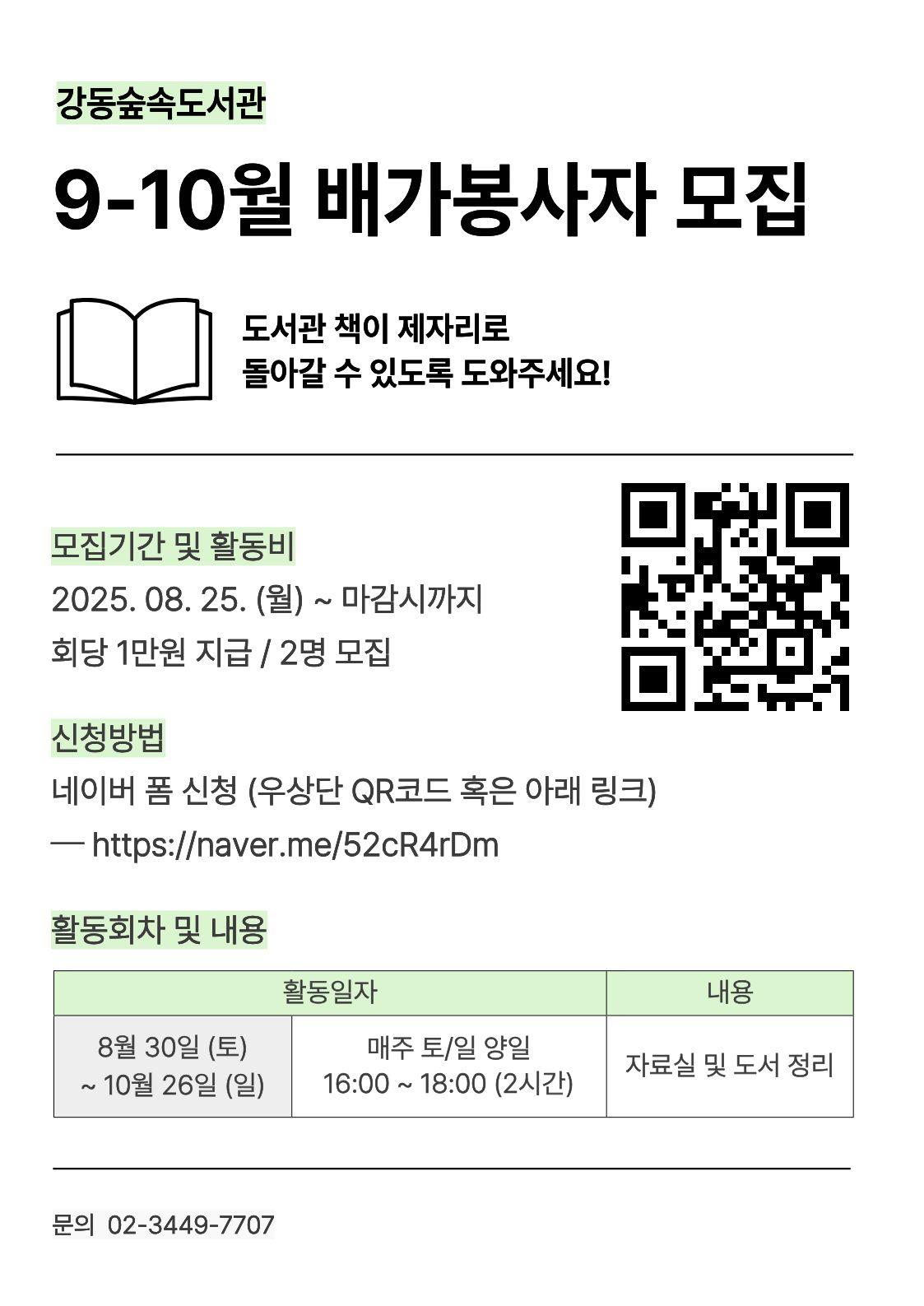 강동숲속도서관 9월-10월 배가봉사자 모집